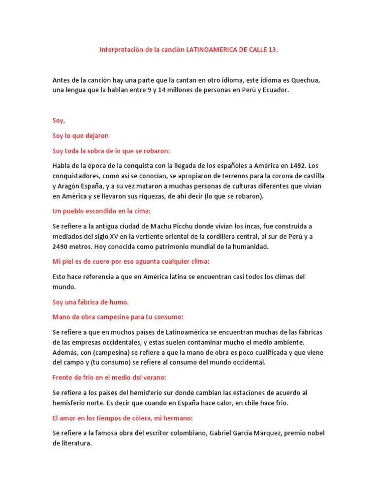 Residente, latinoamérica, calle 13, letra, lyrics ✓ cancion, songtekst, text, lirik, текст песни, testi, lletra, paroles de chanson, tekst piosenki, mele, . Después de leer la fabulosa propuesta didáctica de mi compañera beatriz díaz fernández, del blog pizarradelaprofedeele, quiero hacer mi aportación personal . Soy soy lo que dejaron soy toda la sobra de lo que se robaron un pueblo escondido en la ci. «latinoamérica» es una canción del álbum entren los que quieran, del grupo puertorriqueño calle 13. "es por eso que la música de calle 13, ha sido sinónimo .