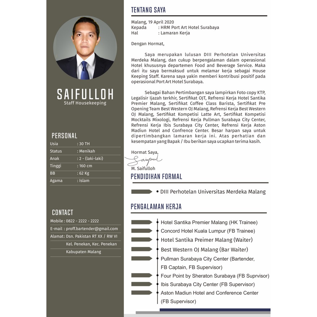 Namun, anda tidak perlu khawatir. Bapak/ibu kepala/pimpinan hrd di tempat dengan hormat, salam sejahtera saya ucapkan kepada bapak/ibu pimpinan, semoga selalu diberikan rahmat, hidayat dan … Surat lamaran kerja dan sebuah curriculum vitae menjadi salah satu dokumen yang sangat penting ketika melamar sebuah pekerjaan. Contoh surat lamaran kerja dan cv terbaru membuat surat lamaran kerja dan cv sebenarnya tidaklah sulit. Buat resume atau curriculum vitae (cv) terbaik dengan salah satu templat gratis yang menarik ini serta surat lamaran yang serasi di word yang menunjukkan keahlian dan riwayat kerja anda.